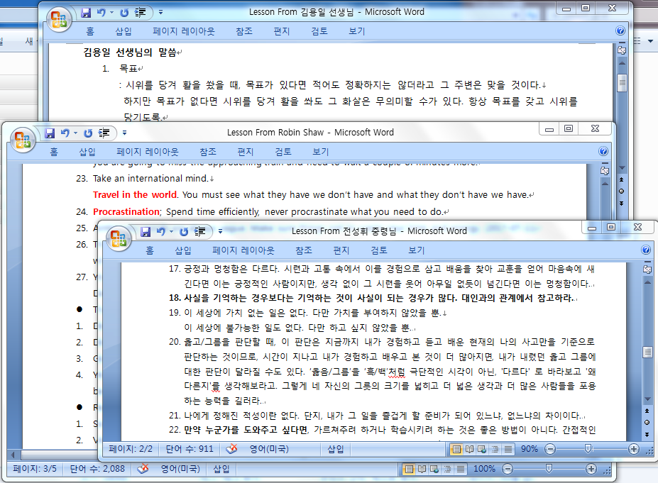 고등학생 때부터, 제 감정을 기록하기 위해 일기를 종종 썼었고, 군대에서도 제가 실수를 하면 그 속에서 깨달은 교훈을 기록하고 같은 실수를 반복하지 않으려고 노력했었습니다. 이렇게 차근차근 기록하는 습관이 생겼고 군대에서 인생계획서를 작성하면서 이러한 습관이 확실히 몸에 배게 했습니다.