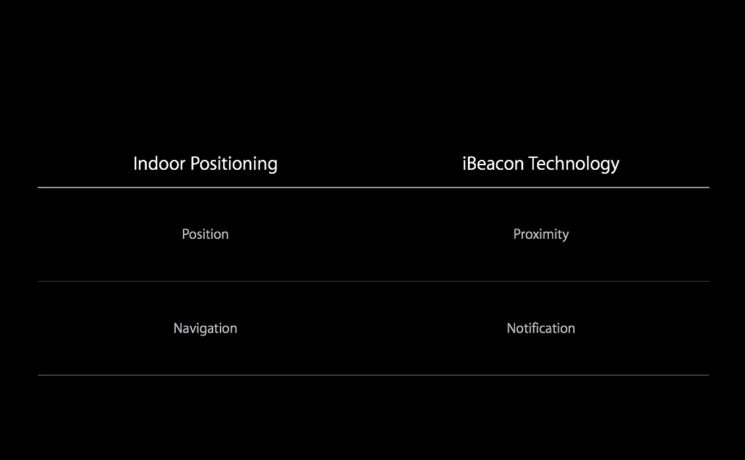 애플의 설명에 따르면, 아이비콘은 거리에 따른 정보(proximity)를 제공하고 (비콘 근처의) 기기의 푸시 알림(notification)을 가능케합니다. 실내 측위는 위치 확인(position)과 방향 안내(navigation)를 위함입니다.