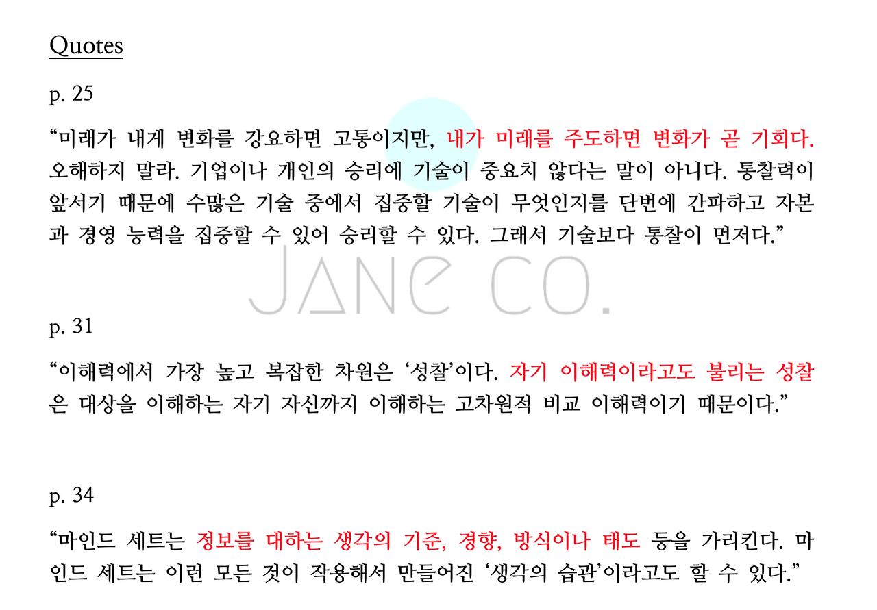J: 제인 컴퍼니는 제가 마지막 사업으로 생각하고 있는 아이템인데, 지난 두 번의 사업을 통해서 (그리고 직장생활을 통해서) 얻게 된 결론 때문에 저는 무조건 지식 창업을 해야겠다고 생각했고, 책을 포함한 지적 자산을 만들어내는 회사로 키워가야겠다고 결심하게 됐어요.
