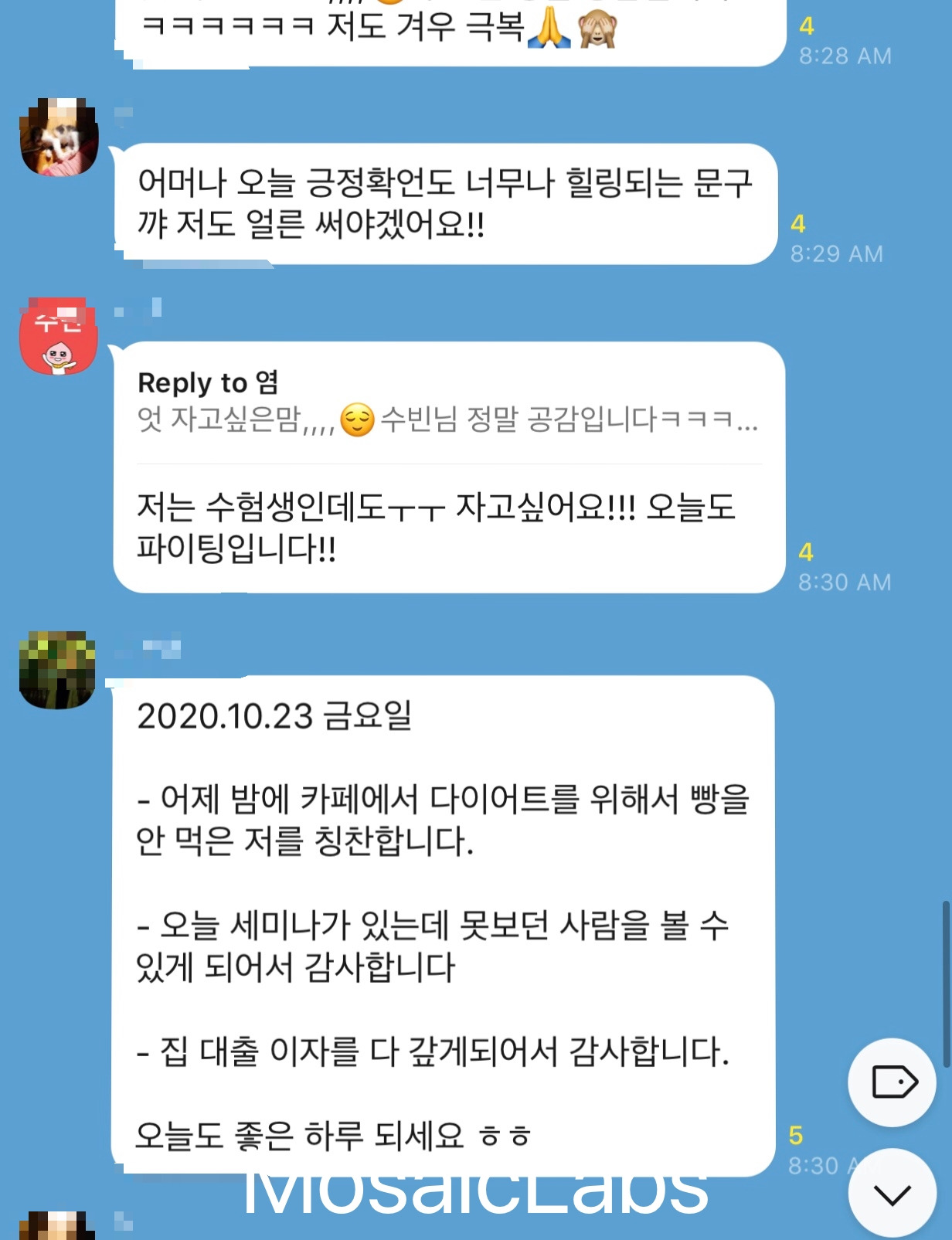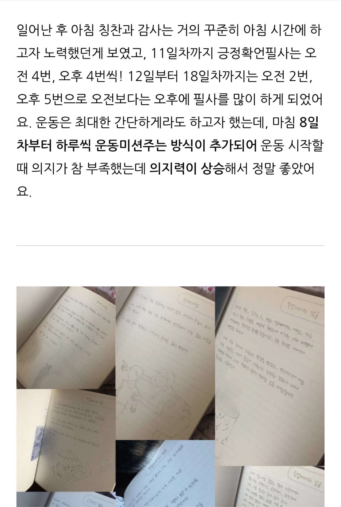 매일 아침 일어나서 루이스 헤이의 <나는 할 수 있어>의 긍정 확언을 필사하고 스스로를 칭찬하는 것 한 가지, 감사한 일 두 가지를 단톡 방에 인증합니다. 필사 내용은 매일매일 달라져요.
