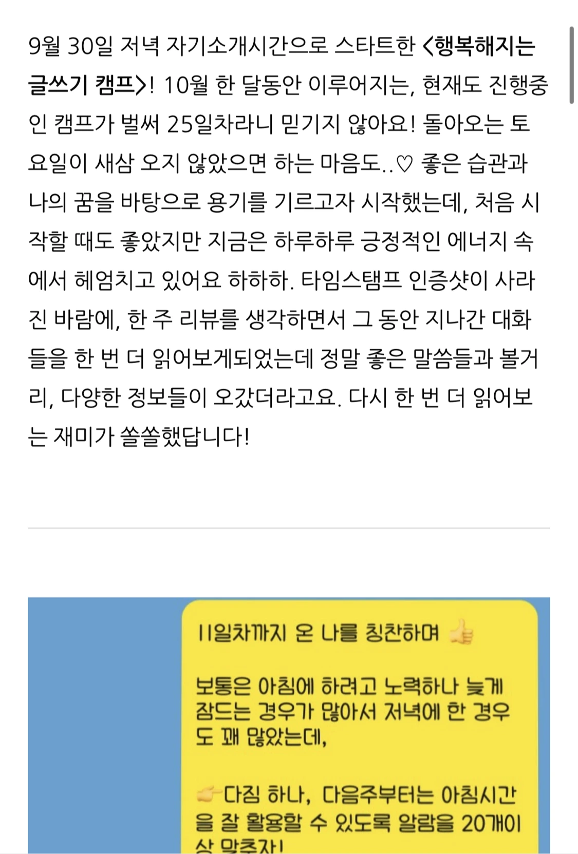 저희 <행복해지는 글쓰기 캠프>에서는 하루하루 나쁜 에너지는 약해지고 좋은 에너지가 강화되는 경험을 하실 거예요.