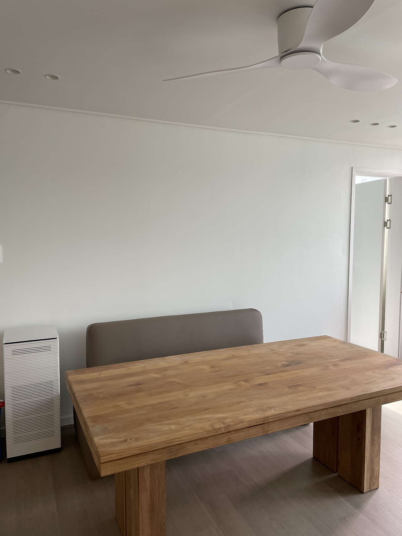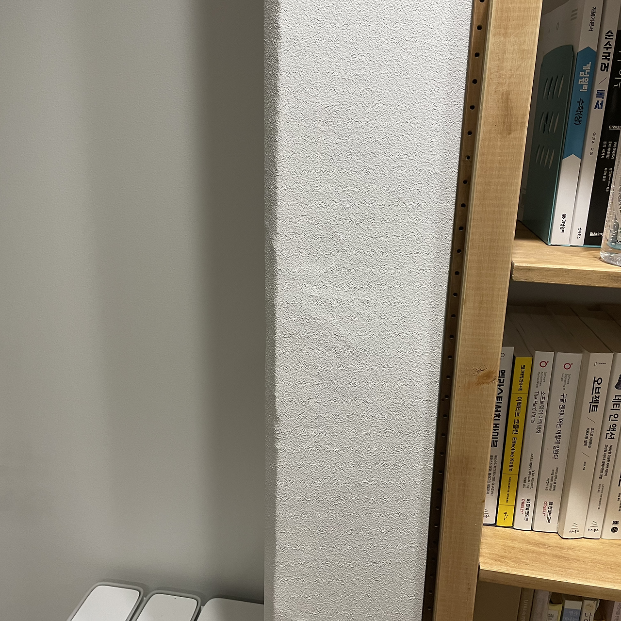 그리고 도배 작업팀이랑 소통이 잘 안 돼서 조금 엉망이 된 곳이 많았다. 주방에 조명을 옮기게 되었는데, 조명 원래 있던 자리는 막아야 한다는 얘기를 깜박했다. 표시라도 해뒀거나 조명설계도라도 드렸어야 했는데 생각지 못했다. 주방 천장에 땜방이 필요했다. 그래도 이건 양호한 편이다. 퍼티를 한다고 했는데, 도배 쪽에서 이렇게 퍼티 하면 안 된다면서 그라인더가 있는지 물어보셨다. 그라인더가 없어서 우리는 스크랩퍼로 벽에 울퉁불퉁 튀어나온 본드나 콘크리트를 매끄럽게 되도록 긁는 작업을 하게 되었다. 한 30분쯤 했나 도배팀에서 그라인더를 갖고 오셔서는 그라인더 있으니 됐다고 하셔서 우린 스크랩퍼 작업을 그만해도 되는 줄 알았다. 막상 도배가 다 마르고 보니, 여기저기 울퉁불퉁하게 된 벽이 너무나도 신경이 쓰였다. 됐다는 표현이 ‘야호 그라인더를 찾았다’ 정도의 의미였던 걸까. 스크랩퍼를 그래도 조금이라도 더 할 걸 아쉬움이 있었지만 이미 돌이킬 수 없다. 세월이 가고 누레지면 그땐 더 잘하자!