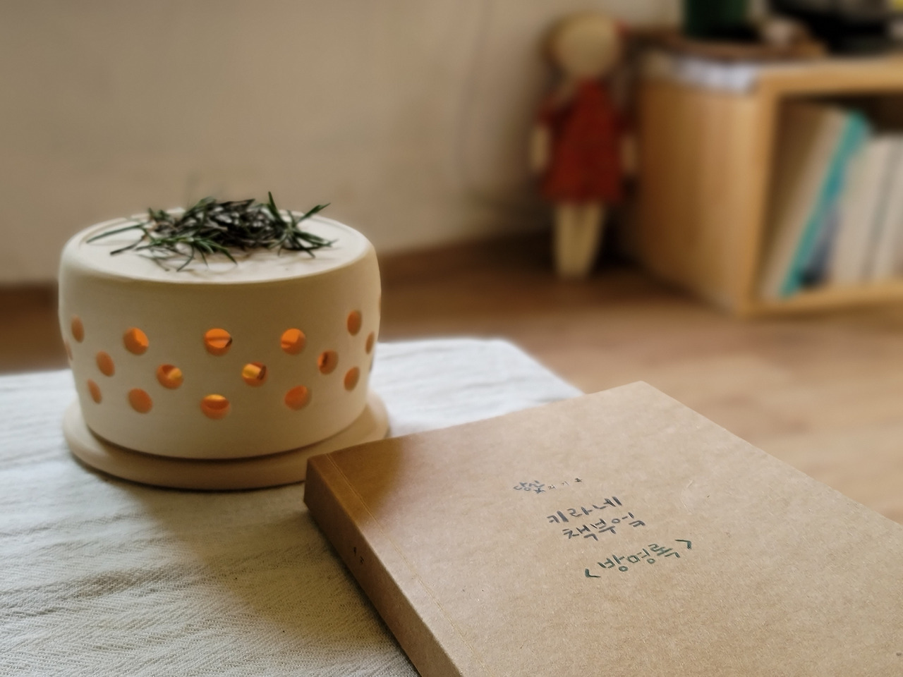 앗. 키라네 책 부엌 전체에 퍼져있는 로즈마리향을 만들고 있던 캔들워머를 발견했다. 알고 보니 그건 책방 주인, 키라 님이 직접 도자기 공방에서 주문 제작하여 만든 거라고 한다. 전시되어 있던 건 아니었는데, 나의 레이더망에 포착된 그것까지 나는 기어코 꽁꽁 싸매 데리고 왔다. 다정한 키라 님은 뒷마당에 있는 로즈메리 가지를 한 움큼 떼어다 함께 싸주셨고. 후아. 나는 상쾌한 허브향을 제주에서부터 집으로 가지고 온 셈.