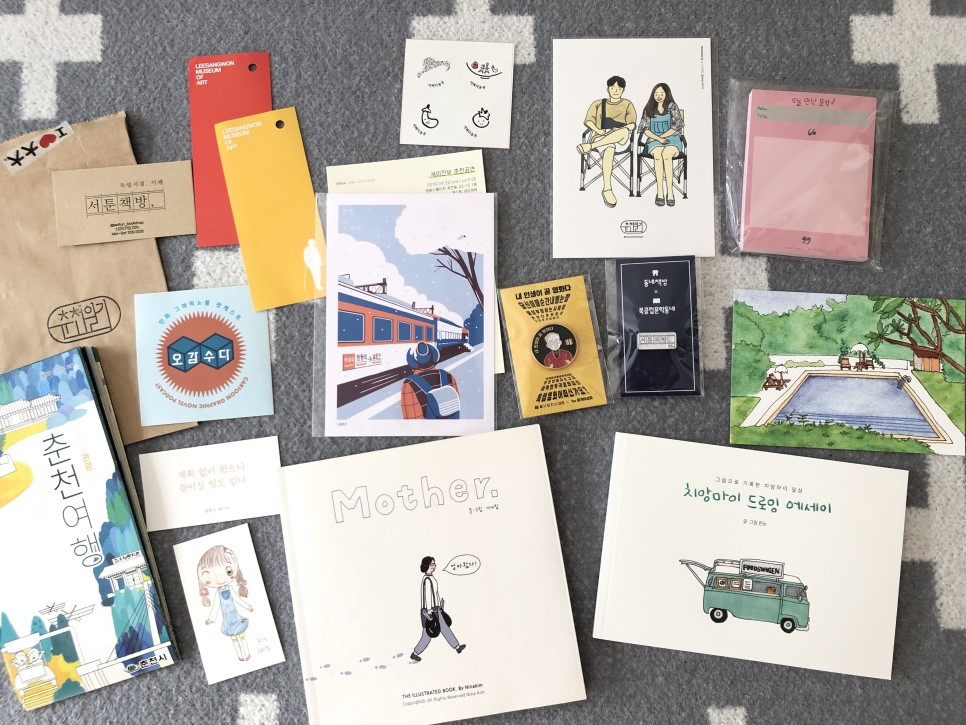 계획 없이 푹 쉬고 오려던 우리는 첫날, 춘천 독립 책방 투어를 했어. 숙소에서 추천해주는 근처 카페와 책방들을 안 갈 수 없겠더라고. 덕분에 '쉼'을 목표로 한 것이 무뎌지고 말았지만 투어는 성공적이었지! 춘천 도심에 젊은이들이 작은 식당이나, 카페, 독립 서점 등을 차리며 삶을 꾸려나가는 숫자가 늘어나고 있는 것 같아. 내가 찾은 다섯 군데 모두 젊은 사장님들이 아기자기한 센스를 가지고 함박웃음 내보이며 그렇게 가게를 꾸려나가고 있었어. (독립 서적 두 권과 핀 배지 두 개랑 그림엽서와 떡메모지를 구입했어.)