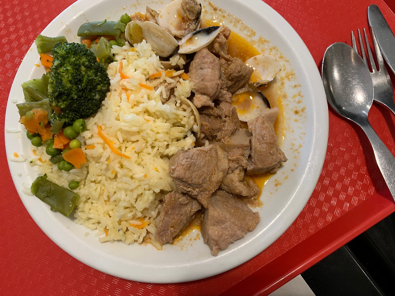 줄을 서고 식판을 들었다. 단출한 메뉴, 무엇을 먹을까 고민할 필요도 없이 포르투갈 정통 음식인 Alentejo(알렌테주 : 지역 이름이기도 하다)를 골랐다. 영어로 <Pork and Clams>라고 불리는 알렌테주는 말 그대로 삶은 돼지고기와 조개를 섞어 요리한 것을 말한다. 우리나라의 된장 보쌈과 비슷한 맛을 내는 듯 하지만 조금 더 퍽퍽한 고기에 조개를 더했다고 하면 이해가 쉬울 것이다. 하얀 밥과 함께 먹으면 짭조름한 양념 맛에 씹는 맛이 더해져 무난하면서도 맛있는 한 끼를 해결하기에 좋다.