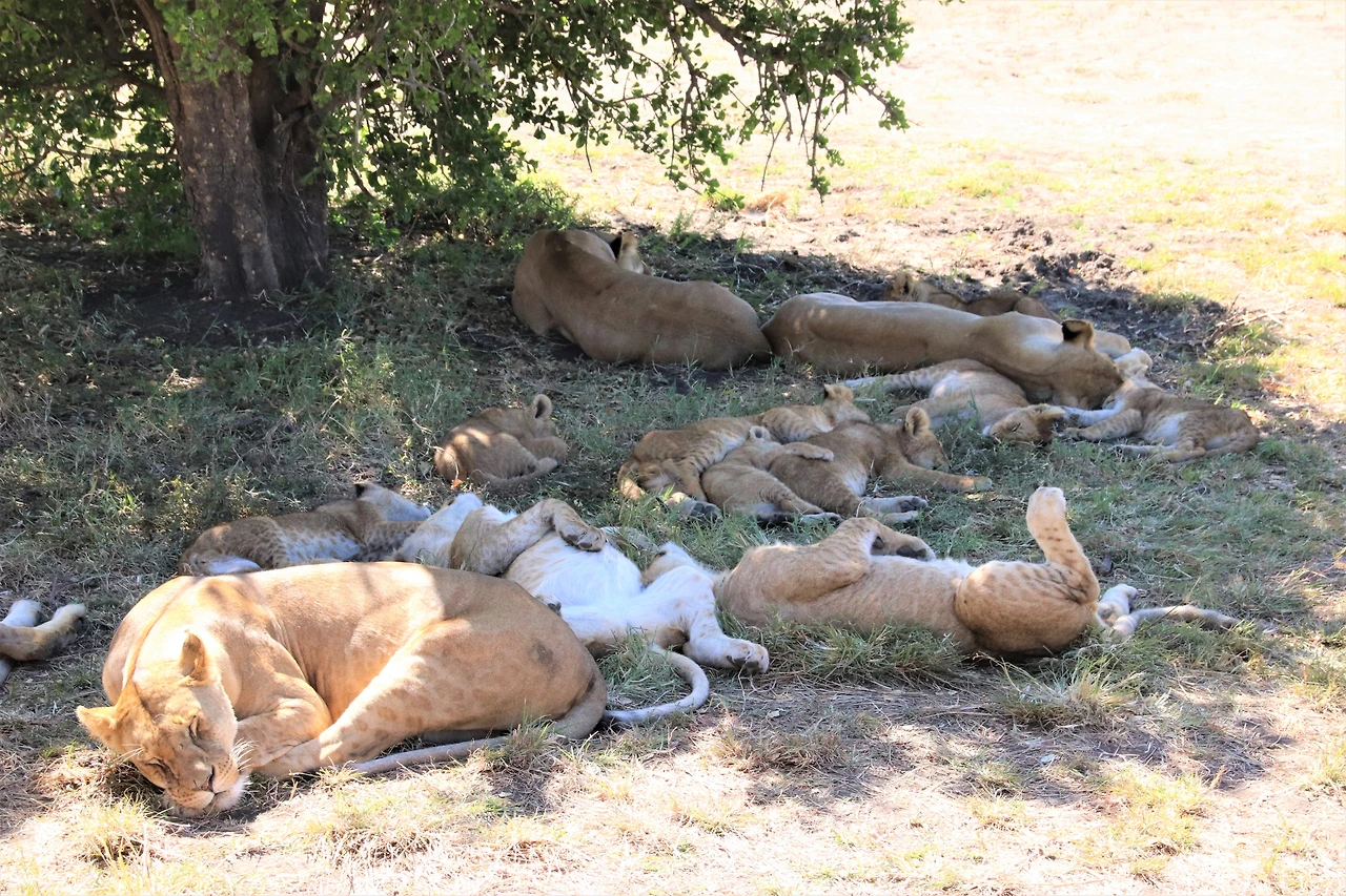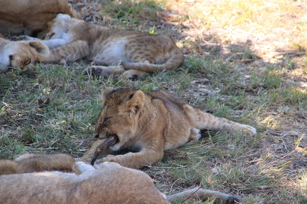 사자의 낮잠 소식을 들은 지프 트럭들은 조금 떨어진 곳에 있는 모양인지 우리 포함 두 대만이 나무 주위에 머물고 있었다. 시동을 껐다가도 방향을 틀어 (다른 각도에서 보기 위해) 다시 시동을 켜는 행위가 반복되는 동안 사자는 끔뻑 눈을 떴다가도 아무 일 아니라는 듯 다시 잠에 빠져들었다. 아기 사자 한 마리는 말라비틀어진 나뭇가지를 입에 물고 혼자 장난을 치고 있었다. 다른 아기 사자 한 마리는 어미 젖을 쪽쪽 빨고 있었는데, 둥근 엉덩이가 돋보이도록 엎드린 채 두 손 모아 젓을 감싸고 있는 모습이 너무 귀여워 고양이의 모양새를 떠올렸다. 생각해보니 아프리카에서 사자나 표범 등의 동물은 캣(cat)으로 통용되고 있었다.