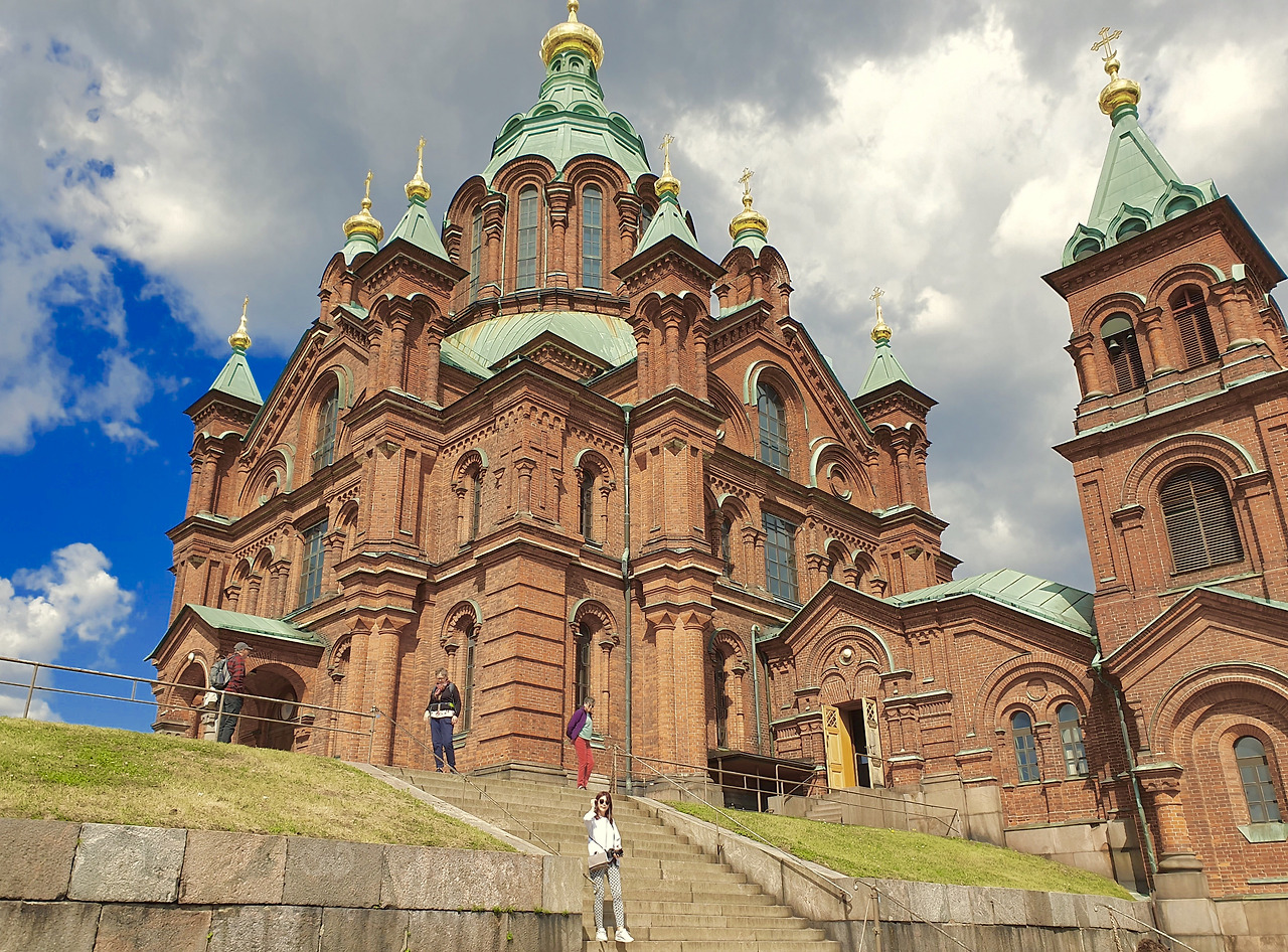 아름다운 건축물 우스펜스키 사원 앞에 서 있다. 사원 꼭대기에 양파 모양의 장식이 고명처럼 얹혀 있네. 그래서 양파 사원이라고도 불린단다.