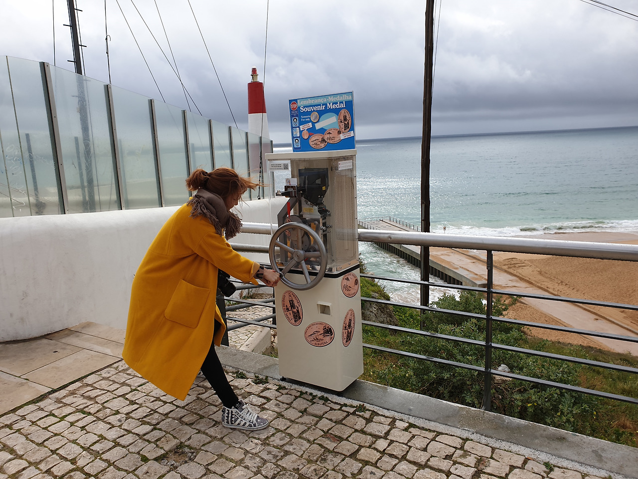 1유로의 동전을 넣으면 알부페리라 해변 기념주화를 찍어주는 기계 앞에 섰다. 끼이익- 하고 돌려보는 원형의 핸들은 녹이 조금 슬었나 보다.