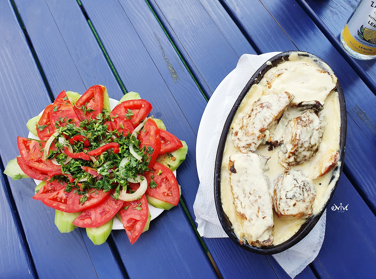 오른쪽 음식은 Shkmeruli(시크메룰리, ლ15)라 불리는 닭요리이다. 우리나라로 치면 갈릭 크림소스 치킨 정도? 조지아에서는 다양한 요리법의 치킨요리를 적잖이 맛볼 수 있다. '치킨'이니까 그럭저럭 다 맛있을 수밖에!