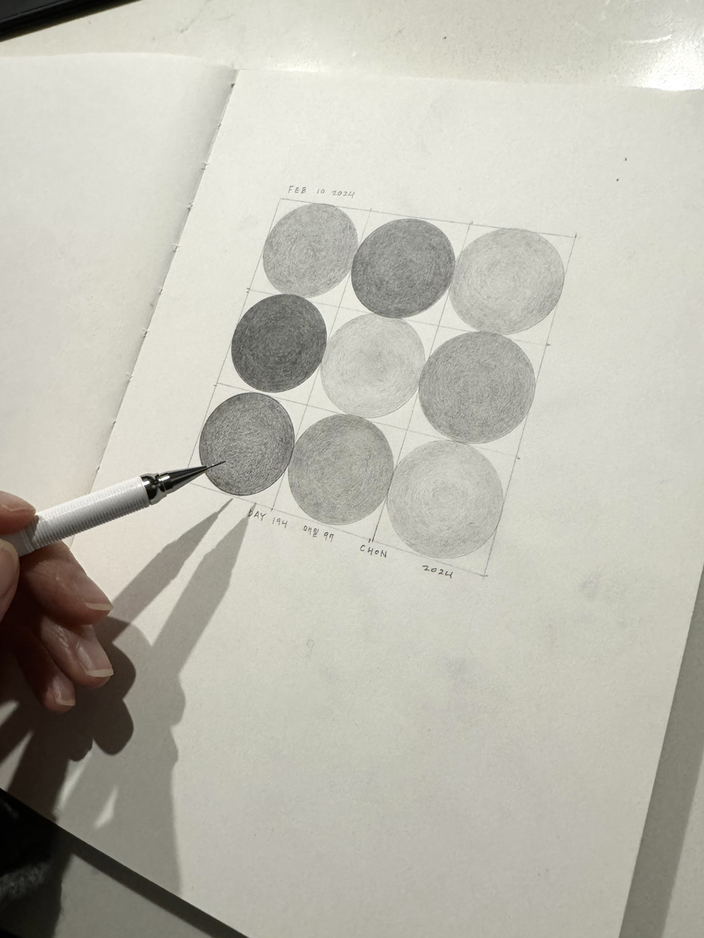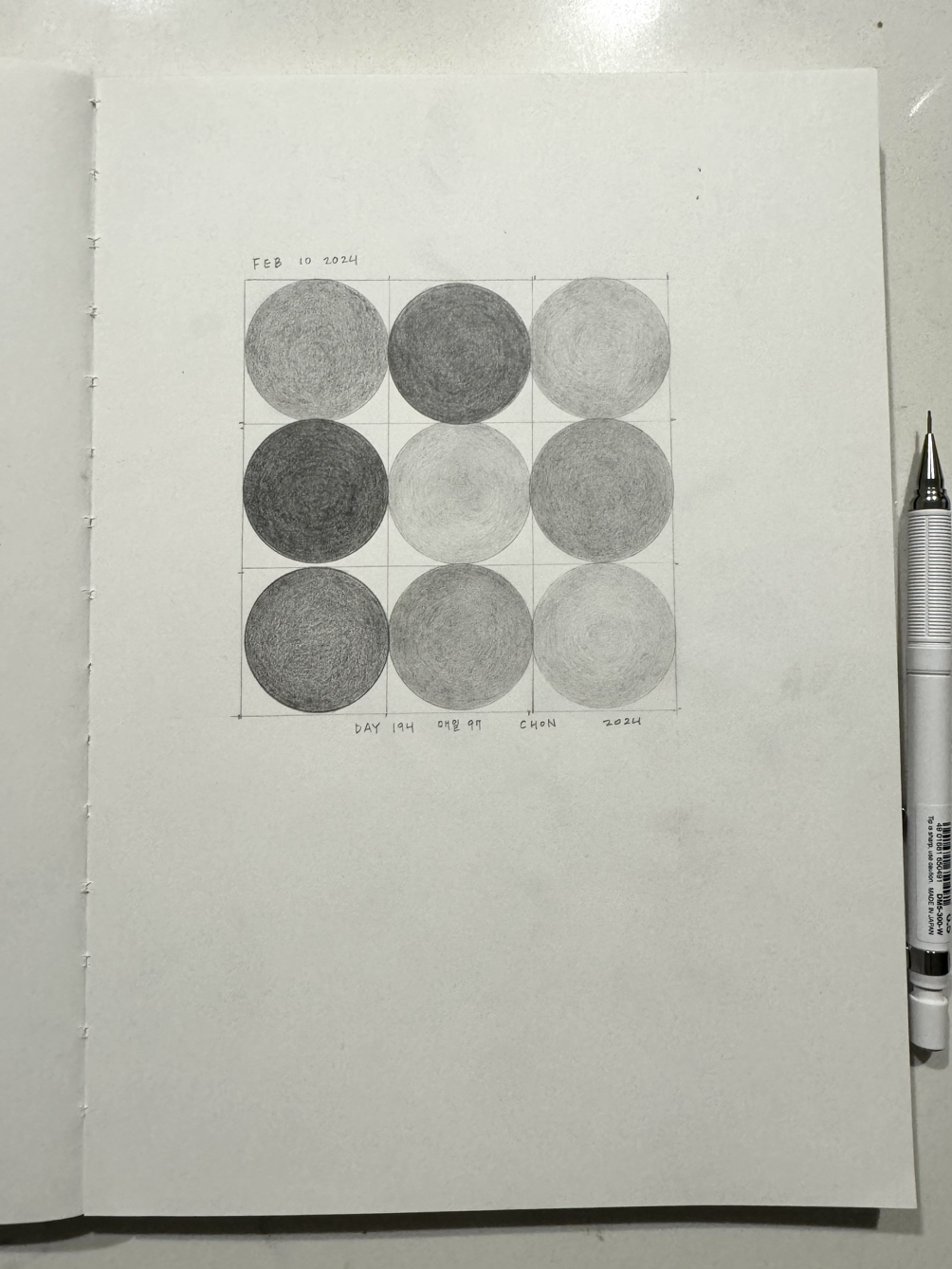 Day One Hundred Ninety Four, 매잉 No. 97, 전이린, 종이 위에 연필 , 17cm x 25cm, 2024