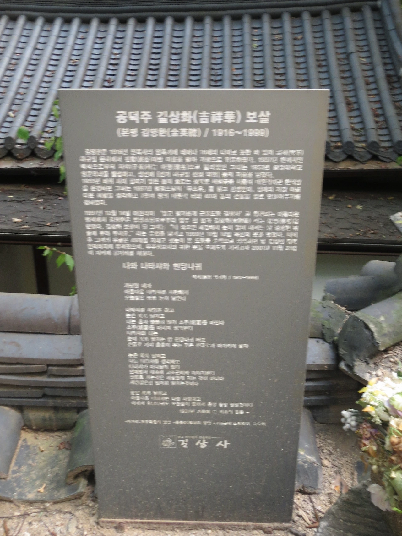가을엔 산 하나 너머 꽃무릇을 보러 성북동 길상사에 갔었다. 김영한의 회고록 ‘내 사랑 백석’에는 아이러니하게도 “그릇과 여자는 내놓으면 깨지기 마련이야”라는 인용 어구가 나온다. 일제시기 3대 미남 문인으로 꼽히며(탤런트 박보검을 연상시키는 외모다) 인기가 많았던 백석과의 관계에 대해서는 과장과 미화가 많다는 학계의 평가가 있긴 하나, 재북작가 백석의 시가 해금된 후 창작과 비평사에 2억 원을 출연해 백석문학상을 제정하도록 하는 등 그의 사랑의 힘은 세월을 뛰어넘었다. 여성의 사회활동이 제약된 시기 1000억 원이 넘는 대원각 요정을 일궈낸 사업가라는 면만 봐도 범상치 않은 인물이었음을 알 수 있다. 집안이 기울며 16세에 조선권번에 들어가게 됐지만 ‘삼천리문학’에 수필을 발표해 ‘인텔리 기생’으로 불렸고 만학으로 중앙대 영문과를 졸업할 정도로 학구파이기도 했다. 1935년 조선어학회 회원으로 제헌국회의원을 지낸 해관 신윤국의 주선으로 일본 유학을 갔던 적이 있다는 것도 뒤늦게 알았다. 나 개인으로는 기자 생활 중 신윤국의 친손자를 부장으로 모시게 되면서 이 얘기를 들었다. 당대 최고 시인 백석을 상대할만한 지성을 지녔던 여인이었다고 보여진다. (내가 썼던 기사 http://www.mt.co.kr/view/mtview.php?type=1&no=2010031114580609368&outlink=1)
