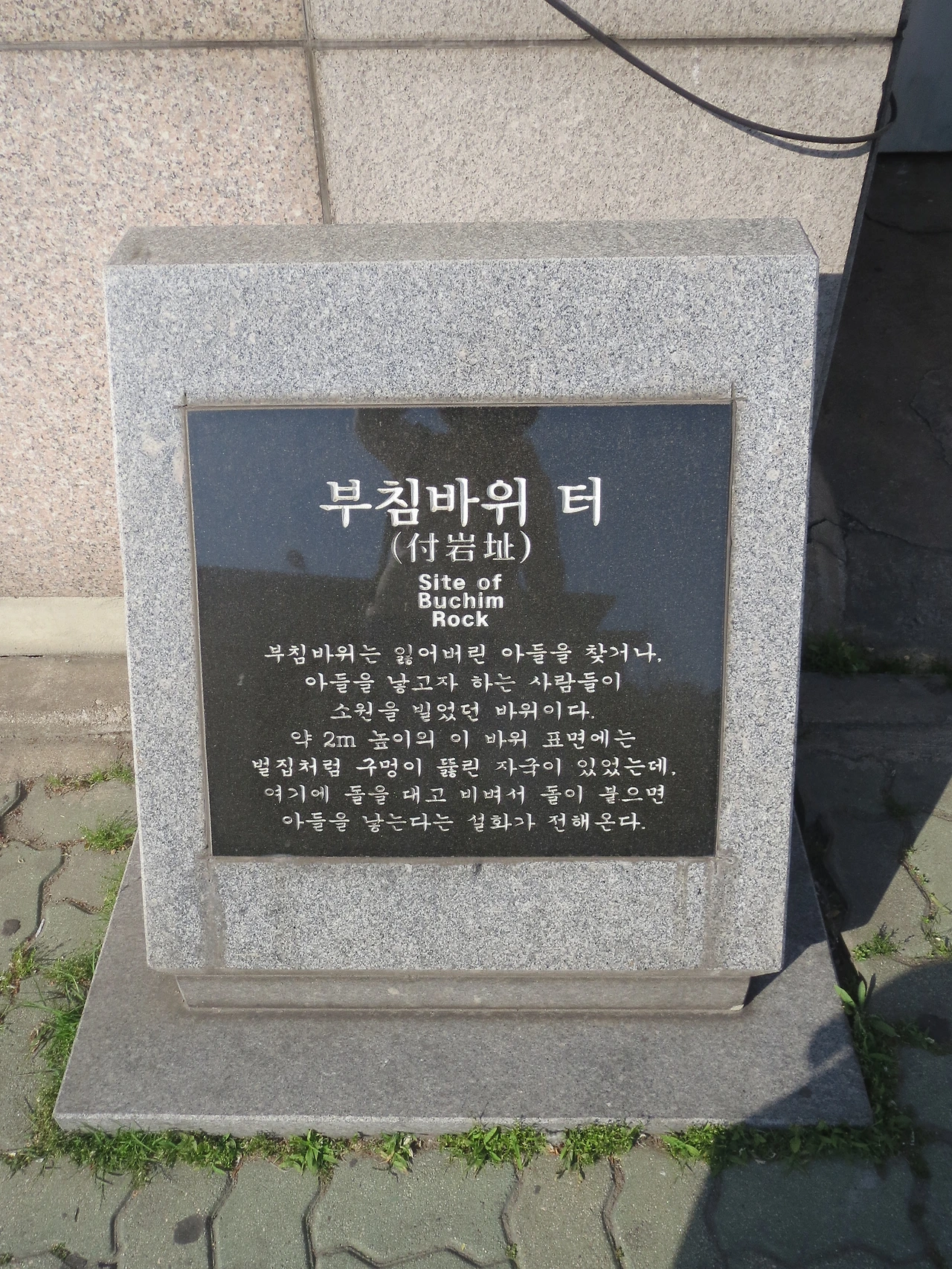 부암동은 부침바위가 만든 이름이다. 부암경로당 앞에는 ‘부침바위 터’ 표지석이 있다. ‘부침바위는 잃어버린 아들을 찾거나, 아들을 낳고자 하는 사람들이 소원을 빌었던 바위다. 약 2m 높이의 이 바위 표면에는 벌집처럼 구멍이 뚫린 자국이 있었는데, 여기에 돌을 대고 비벼서 돌이 붙으면 아들을 낳는다는 설화가 전해온다’고 새겨져 있다. 서울시 홈페이지에 따르면, 1970년 도로확장공사로 바위가 없어지기 전까지는 여인들이 바위에 돌을 붙여놓고 정성스럽게 절을 하는 모습을 쉽게 볼 수 있었다고 한다.
