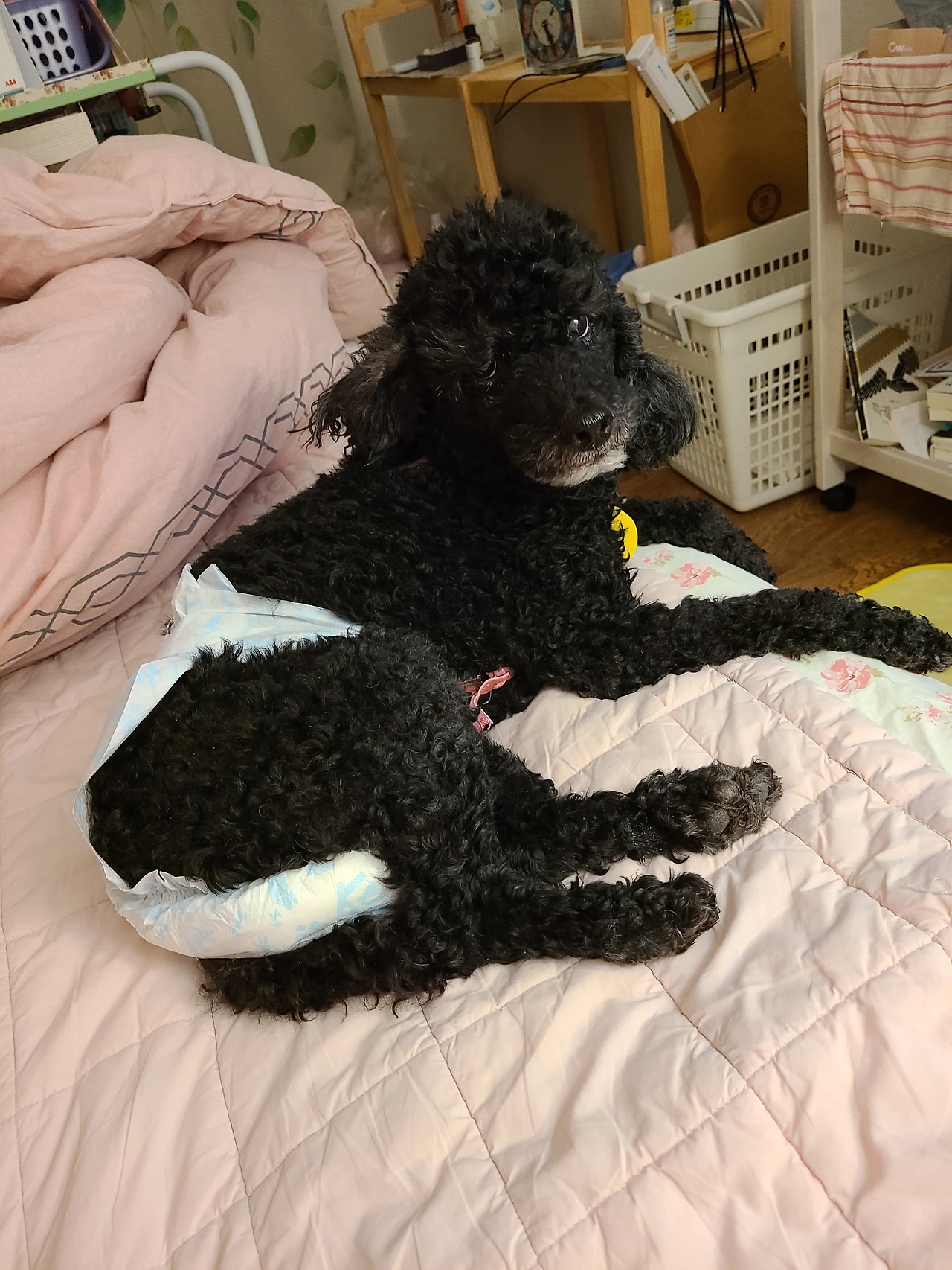 네 다리로 서지 못하는 것 같더니, 내가 보지 않을 때 정신이 나면 집안 여기저기를 돌아다니면 오줌과 변을 흘렸다. 나는 하루종일 그 흔적을 따라다니며 치우고 여전히 몸무게가 꽤 나가는 녀석을 안고 욕실로 가 씻기느라 오른팔의 근육통이 심해졌다. 온라인 커뮤니티에서 조언을 얻어 녀석이 화장실로 즐겨 쓰는 세탁실 앞을 박스로 막고 그 공간에 이불로 싼 해피를 넣어놨다. 물도 먹지 않자 주사기로 매실액을 탄 물을 흘려넣어줬지만 그 조차도 그냥 흘러내렸다. 이불에 똥오줌을 싸면 그냥 이불을 빨아 건조기에 말려 준 것도 며칠 되지 않았다.