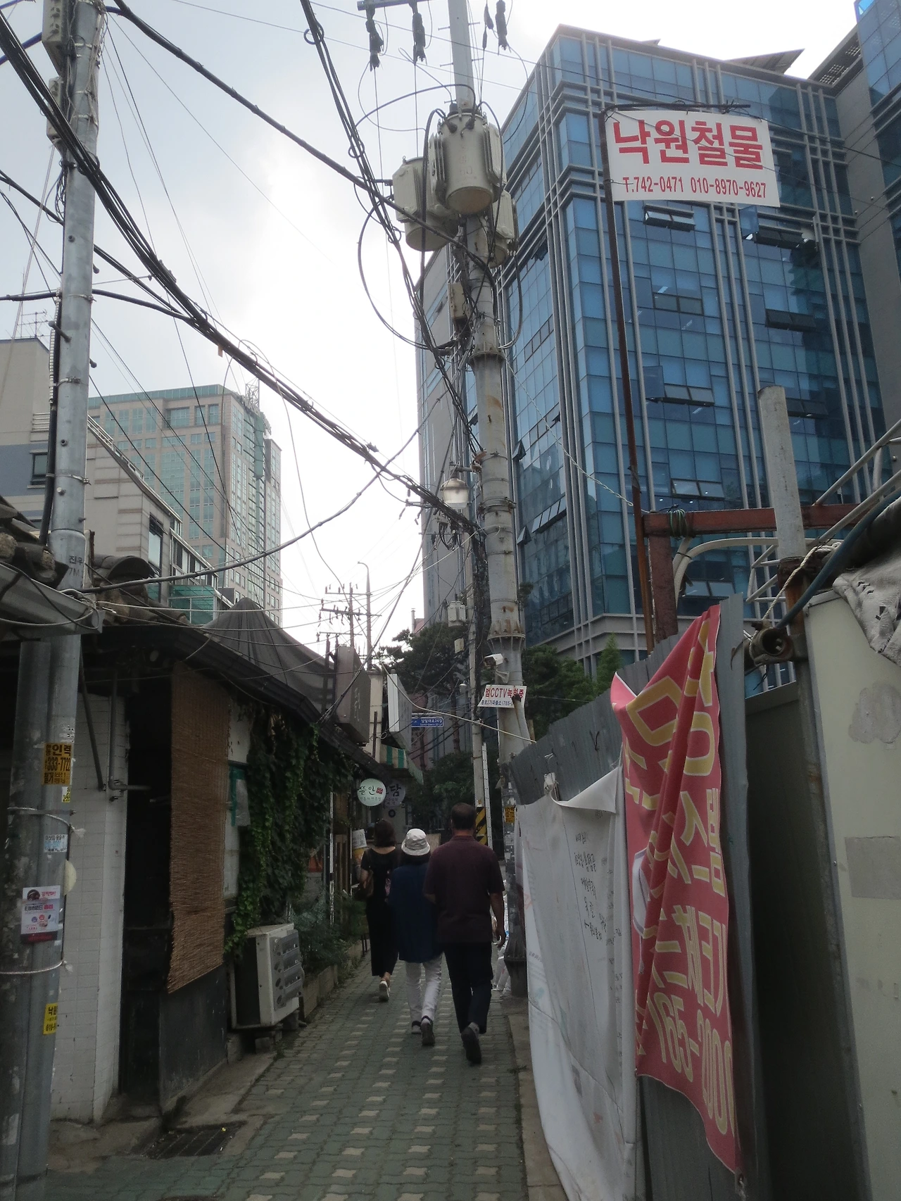 나의 눈에 가장 먼저 들어온 것은 이곳을 삶의 터전으로 삼아 살아왔을 노인들의 지친 모습이었다. 때 이른 이상 폭염으로 바깥문을 열고 골목에 나앉아 담배를 피우던 노파는 카메라를 목에 건 나를 적의 어린 시선으로 바라봤다. 나는 무슨 죄라도 진 듯 재빨리 그 골목을 빠져나왔다. 이 골목은 노동계층의 것이었다. 평생을 고된 노동에 시달렸을 듯 제대로 키도 자라지 못한 채 허리가 굽은 노인이 차가 들어설 수 없는 좁은 길을 리어카를 끌며 지나갔다. 햇볕에 탈 대로 탄 초로의 노동자들은 짧은 처마 밑에 앉아 휴식을 취하거나 허름한 간판을 건 선술집 앞에 내놓은 양철 테이블에 둘러앉아 술잔을 기울였다. 지금은 무산된 재개발 계획이 언제 시행될지 몰라 수리 한번 제대로 못한 이 지대 백여 채 한옥은 지독히 낙후됐다. 더 이상 밀려날 데 없는 늙고 힘없는 사람들이 세 살이를 많이 한다고 들었다. 서울시내 보이지 않는 지대를 살아가는 이들이 그나마 누리던 공간을 앗는 것은 도리가 아니라는 생각이 강하게 들었다. 일부 네티즌들이 “그런 동네들을 그냥 좀 내버려두면 안 되냐”고 피로감을 호소하는 것도 일리가 있다.