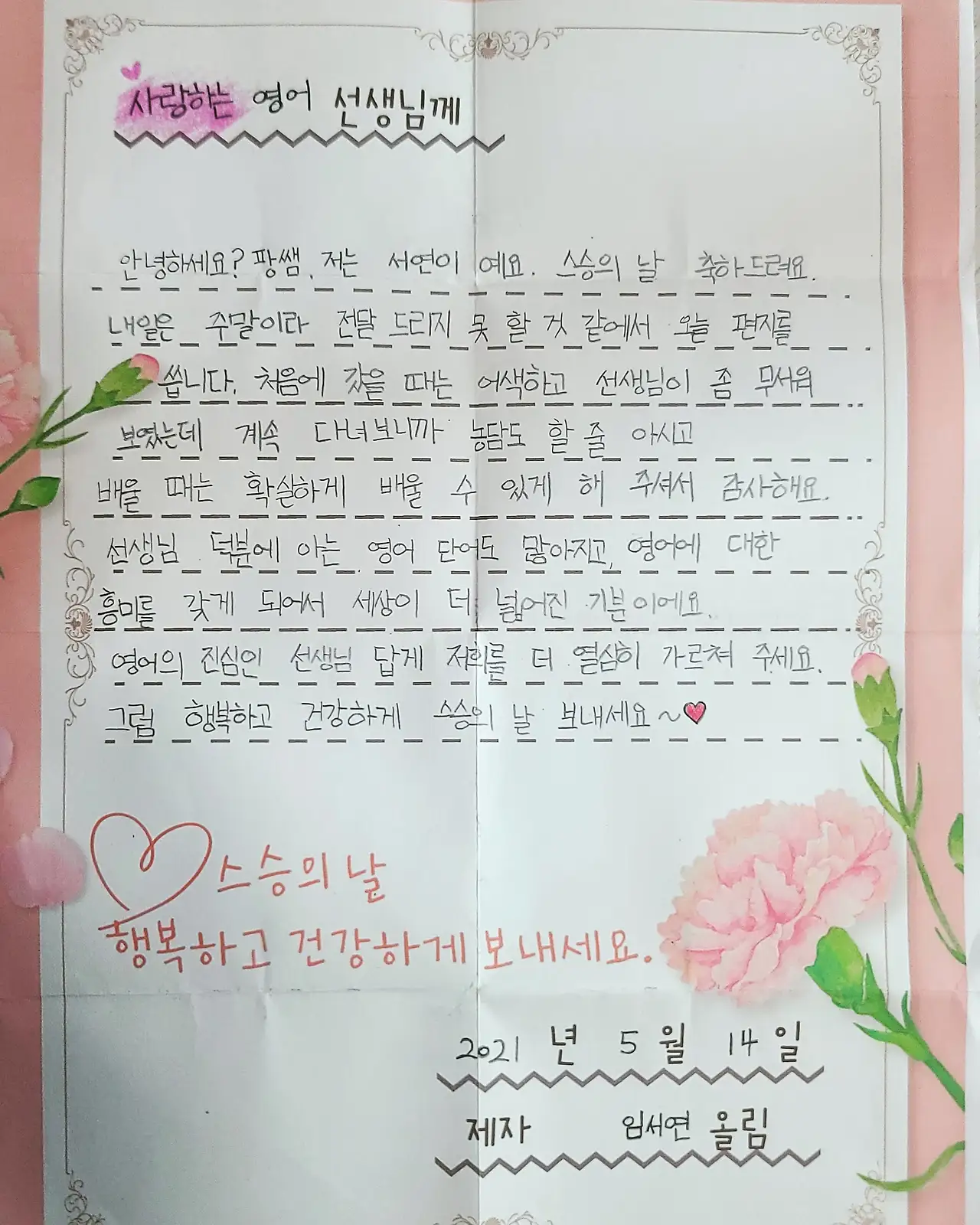 내심 걱정하면서 종이를 펼치니 분홍 꽃 테두리에 둘러싸인 손편지가 보였다.오랜만에 받아보는 손편지를 읽으니 마음속에서 기쁨이 몽글몽글하게 피었다. 그러다 울컥 눈물이 났다. 꾸밈없고 진솔한 마음으로 쓴 편지는 '괜찮아, 잘하고 있어.'라고 어린 제자 서연이가 움츠린 스승의 어깨를토닥여주는 것 같았다. 가까이 있던 다른 제자가 그 모습을 보더니 놀래서 큰 소리로 물었다.