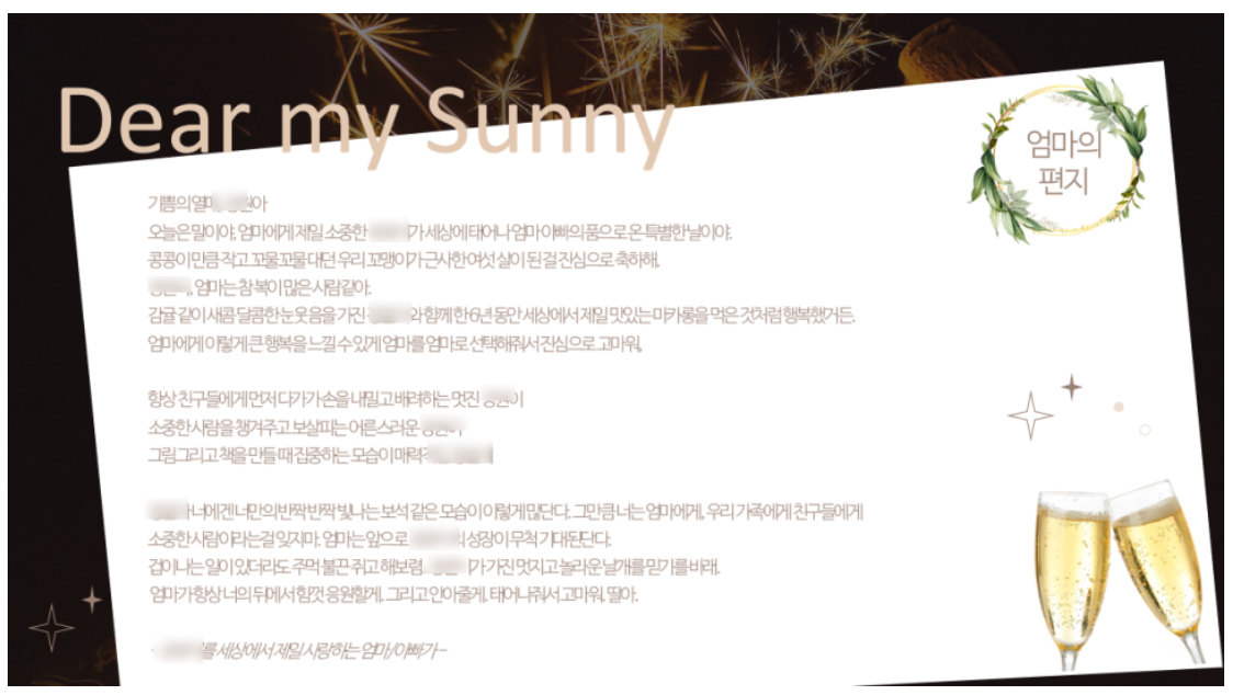 아래는 편지의 전문입니다. 마음은 더 진하고 오글거렸지만 아이가 이해할 수 있는 수준으로 최대한 희석해서 농도를 묽게했음에도 지금보니 부끄럽습니다.