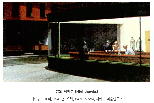 코로나의 영향으로 사회적 거리두기가 범국가적 캠페인이 되었다. 공원의 산책길에도, 순서를 기다리는 줄에도, 카페의 좌석에도, 버스와 비행기에서도 이러한 분위기를 느낄 수 있다. 사회적 이슈가 된 거리두기를 보고 있노라면 에드워드 호퍼의 그림을 보는 듯하다.