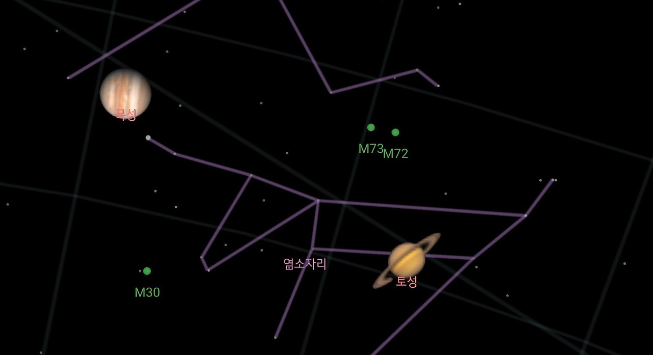 자정이 지난 시각. 마당에 나가 하늘을 바라보니 엊그제 보았던 둥근달이 어느새 기울어져 있다. 그래서인지 목성이 더 빛을 발하고 있다. 별자리 좌표를 찍어보니 목성 옆으로 토성도 희미하게나마 밤하늘을 지키고 있다.