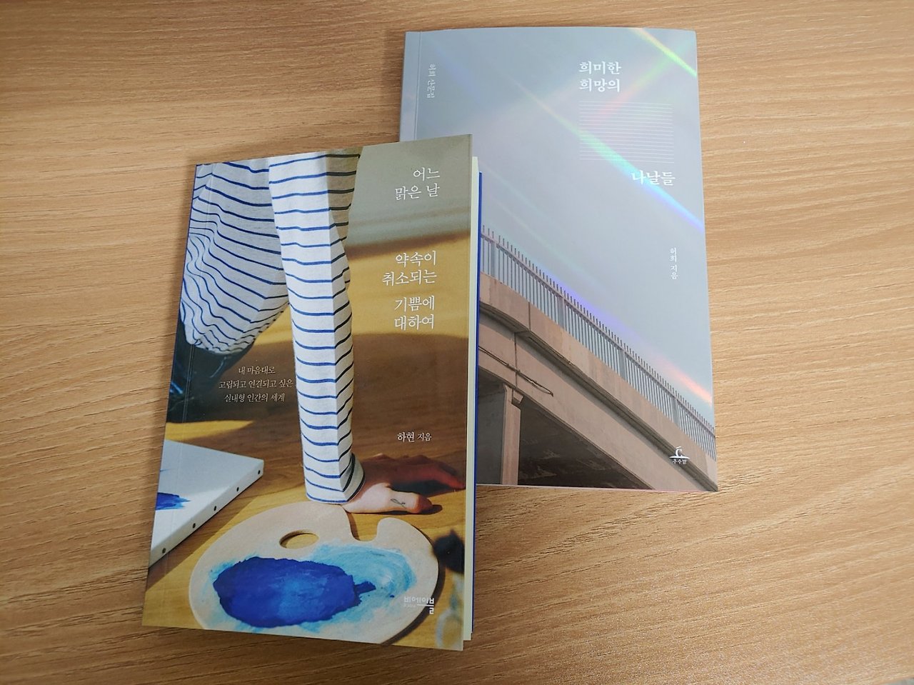 간밤엔 두 권의 책을 읽었다. 하현 작가의 <어느 맑은 날 약속이 취소되는 기쁨에 대하여>와 허희 평론가의 <희미한 희망의 나날들>이었다. 전자는 지인의 추천으로 후자는 라디오 청취 중에 알게 된 책이었다. 두 권을 완독하고서 잠을 청하러 뒷방을 나오니 새벽이 가까워졌고 안방의 어머니는 잠자리에서 일어나 TV를 켜놓고 있었다.