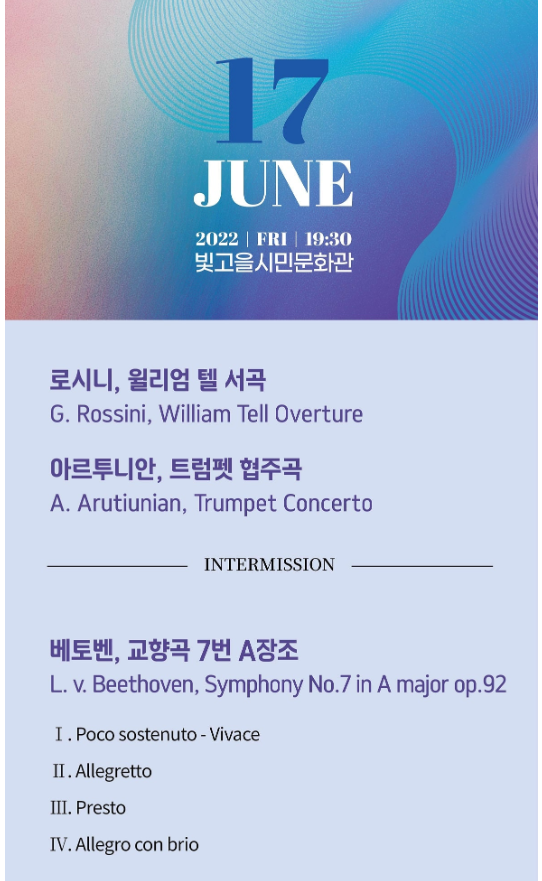 오늘의 레퍼토리는 대중들에게 익히 알려진 윌리엄 텔 서곡과 트럼펫 협주곡 그리고 베토벤 교향곡 7번이었다. 나는 윌리엄 텔 서곡을 감상할 때는 아들과 신뢰의 상징인 사과에 꽂힌 화살보다 일본 코미디 프로가 생각나서 배시시 웃으며 감상을 한다. 윌리엄 텔 서곡을 배경으로 코미디언과 가수들의 예능을 보며 폭소를 자아냈던 기억이 있어서다. 클래식으로도 코미디가 된다는 신박함이 인상적인 프로였기에.