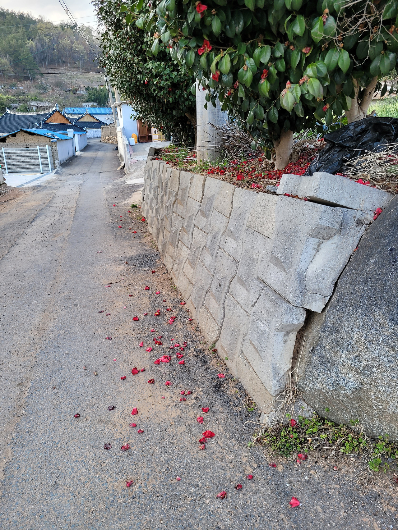 나 홀로 유유자적 산책을 마치고 돌아오는 길. 대문 앞에는 오늘도 동백이 지고 있다. 화사한 벚꽃의 갬성을 담고 와서인지 평소와는 다르게 낙화의 애처로움이 인다. 싸리 빗자루를 가져와 다독이듯이 동백꽃을 쓸어 담는다. 처연한 느낌은 들지만 쓸쓸해 보이지는 않는다. 떨어지는 마지막까지 붉은 꽃의 자태를 보여줘서일 것이다.