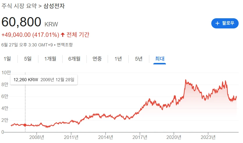 아래는 지난 20여 년간 삼성전자 주가 차트이다.