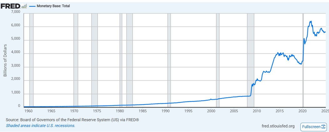 아래 그래프는 1960년대부터 2025년까지 미국 연방준비제도(Fede-ral Reserve, 줄여서 Fed)가 발표한 미국의 통화기초(Mone-tary Base: Total) 데이터를 보여주는 그래프이다.
