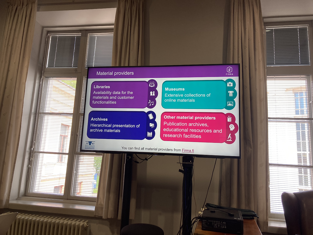 도서관 투어 이전에 직원들이 일하는 사무실을 먼저 보여주셨어요. 상당히 많은 직원들이 일하고 계시더라고요. 사무실 옆에 고서와 희귀본을 모아두는 장소에서 핀란드 국립도서관 전자서비스인 핀나(Finna)를 소개해주었습니다. 핀나에 대해서는 국립중앙도서관에 잘 요약되어 있는 기사가 있어 한번 보시면 이해가 빠르실 것 같습니다.
