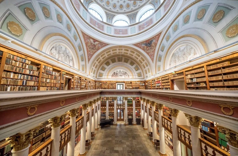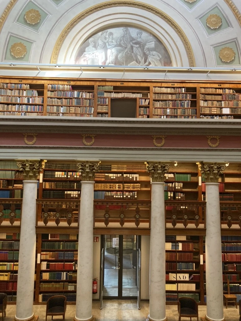 사진으로 보시면 알겠지만 핀란드 국립도서관은 대리석으로 된 하얀 기둥 위로 돔이 있는 건축물이 그리스 양식을 떠오르게 합니다. 독일 유명한 건축가 카를 루드비히 엥겔(Carl Ludvig Engel)이 건축했다고 합니다. 채광에 특별히 신경 써 햇빛을 오랫동안 많이 받기 위해 지붕을 돔 형태로 만들었다고 하는데요. 이 건물은 밖에서 보는 것보다 안에서 보는 것이 훨씬 아름다워요. 벽면을 가득 채운 서가 중앙으로 돔 천장으로 들어오는 자연 채광이 비추고 서가 사이엔 그리스 양식으로 된 장식들이 사진으로만 보던 아름다운 도서관을 떠올리게 하는 곳이에요. 도서관 건축물에 탄성을 지르는 우리에게 도서관 내부 투어를 시켜주던 유쾌한 사서는 이 건축물이 정말 마음에 들지 않는다고 건축가를 다시 뽑고 싶다는 농담을 했습니다.