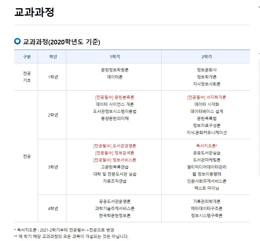 처음 입학하고 배운 전공과목은 문헌정보학원론, 도서관사, 서지학, 정보봉사론, 정보검색론이었다. 지금은 교과과정이 조금 변동된 듯하여 모교 홈페이지를 찾아보았다.