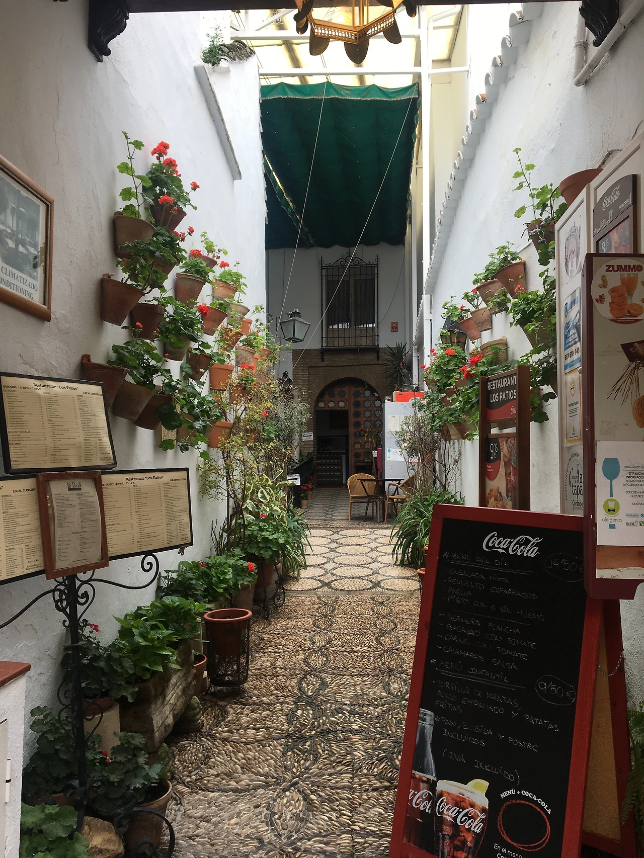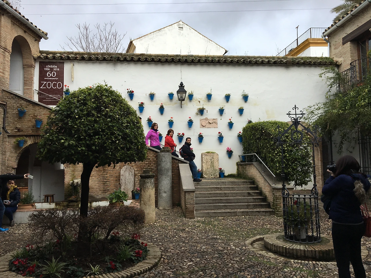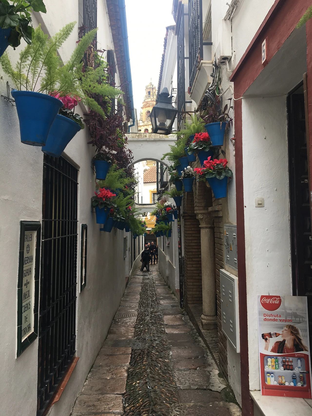 성당 밖으로 나오니 기념품들을 파는 상점 사이로 아랍식 견과류와 건과일을 파는 상점들이 있다. 독특한 향신료와 물 담배도 함께 팔고 있다. 북부 여행을 할 때는 볼 수 없는 전혀 다른 분위기가 재밌다. 가는 곳마다 같은 나라가 맞나 싶을 정도로 전혀 다른 문화가 있는 것이 바로 스페인의 매력이다. 다음으로 코르도바에서 유명한 유대인 거리로 향했다. 하얀 벽에 화분이 걸려 있는 아기자기한 집들이 모여 있다. 집집마다 빨간 꽃과 화분을 벽에 걸어 두었는데 별거 아닌 것 같은 조그만 꽃 화분이 거리를 아름답게 만들어주고 있다.