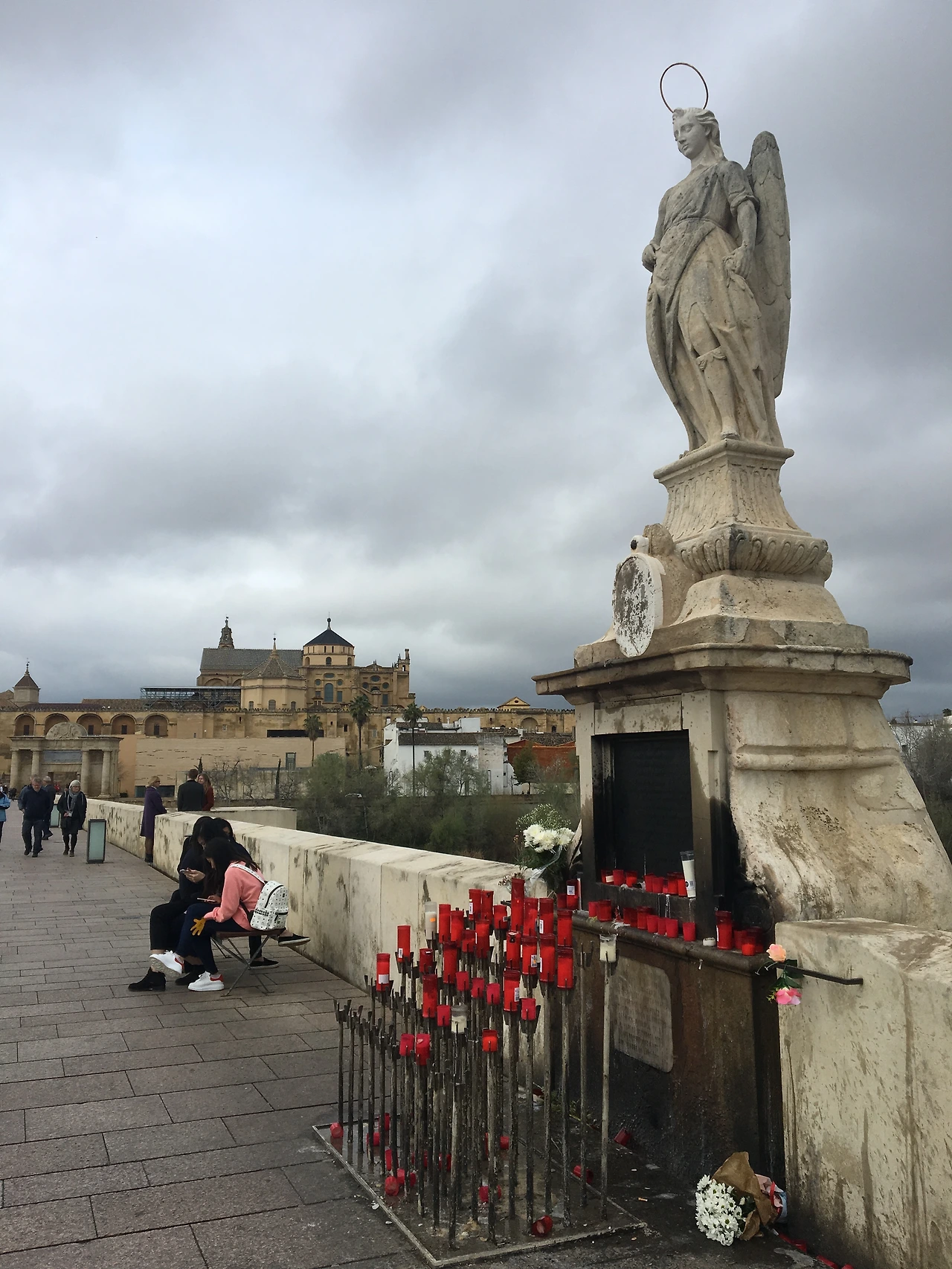 로마인 다리로 가보기로 한다. 한 도시에 아랍과 유대인 그리고 로마인의 흔적까지 남아있다니 참 신기한 도시이다. 아까 봤던 건축물들과는 다르게 네모 반듯하고 웅장한 다리가 강을 가로지르고 있다. 다리 위에는 천사와 가톨릭 성인들 조각상이 세워져 있고 그 밑에 사람들의 기원을 담은 초가 불을 밝히고 있다. 카를교에서는 조각상의 발을 만지면 다시 돌아온다는 전설이 있다는데 혹시 코르도바도 마찬가지일까 싶어 괜히 애꿎은 조각상의 발을 만져본다. 메스키아에서는 무사히 돌아갈 수 있기를 기도했는데 이곳에서는 무사히 돌아올 수 있기를 기도해본다. 코르도바는 떠나기도 전에 돌아올 생각을 하게 하는 도시다.