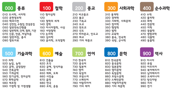 이런 고민을 해결하기 위해 미국의 듀이라는 사람이 십진분류법(DDC)이라는 책 분류기준을 만들었다. 십진분류법은 10자리 숫자로 주제를 나누어 각기 숫자에 주제를 매치하고 책의 내용과 주제에 따라 번호를 부여하는 분류기준이다. 한국에서는 이 DDC라는 분류법을 그대로 따르지 않고 한국의 실정에 맞게 변경해 한국십진분류법(KDC)라는 명칭으로 사용하고 있다.