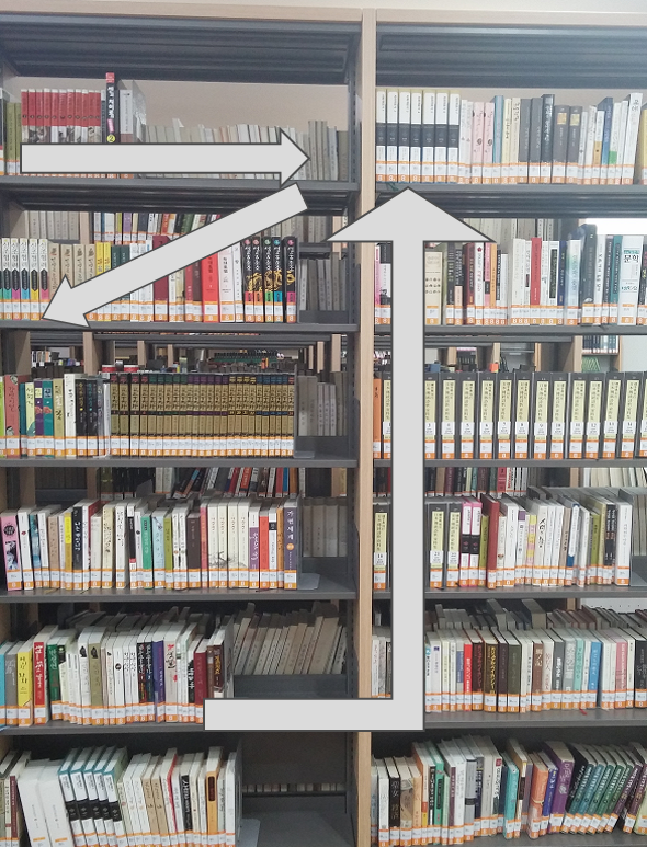 보통 서가 좌우로 청구기호를 표시한 게시물을 부착하고 있으니 서가에 붙어있는 청구기호표를 보고 책을 찾아가면 된다. 책은 번호순으로 꽂혀있는데 대개 좌에서 우로 오름차순으로 꽂혀있다. 이곳에서 청구기호를 보고 책을 찾으면 된다.