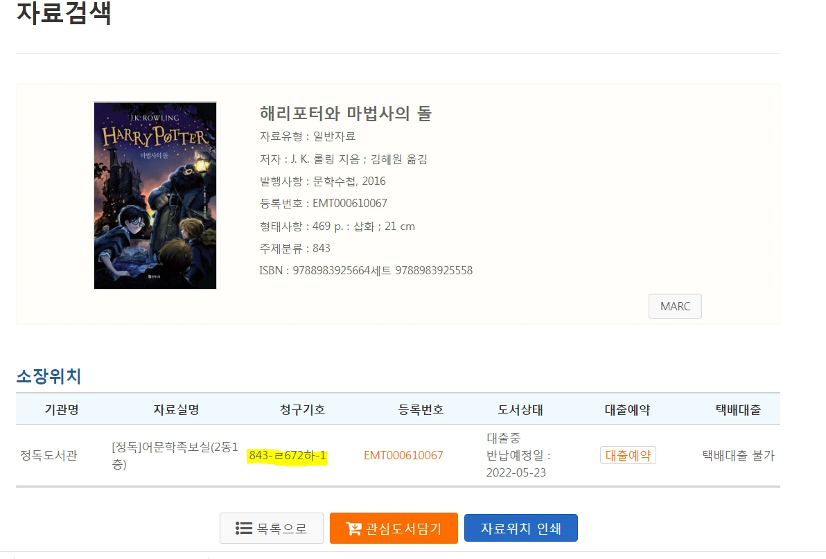분류기호가 843이니 영미문학 중 소설이 주제이고 도서기호는 ㄹ672하이다. ㄹ672는 롤링의 이름을 나타내고 뒤에 붙은 하는 책의 제목을 표현한다. 843이라는 영미소설을 모아놓은 서가에 롤링이 지은 책들이 따로 모일 수 있도록 자리를 지정한 것이다. 그럼 이제 실제 도서를 찾으러 가보자.