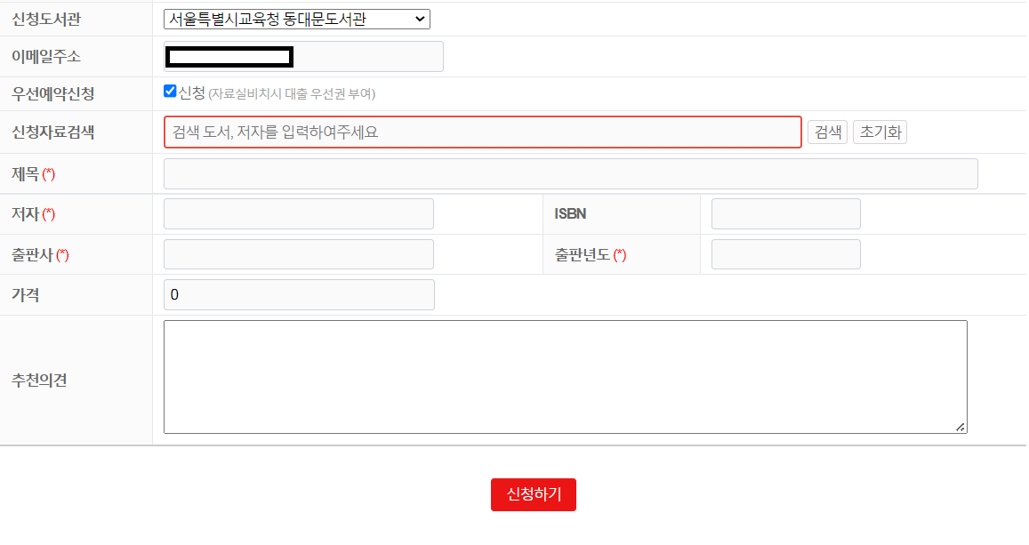 신청하고 싶은 책의 제목과 저자, 출판사. 출판 연도 등을 적으면 신청이 된다. 신청 시 우선예약신청을 하면 책이 도서관에 들어왔을 때 가장 먼저 대출할 수 있도록 예약을 걸어준다.