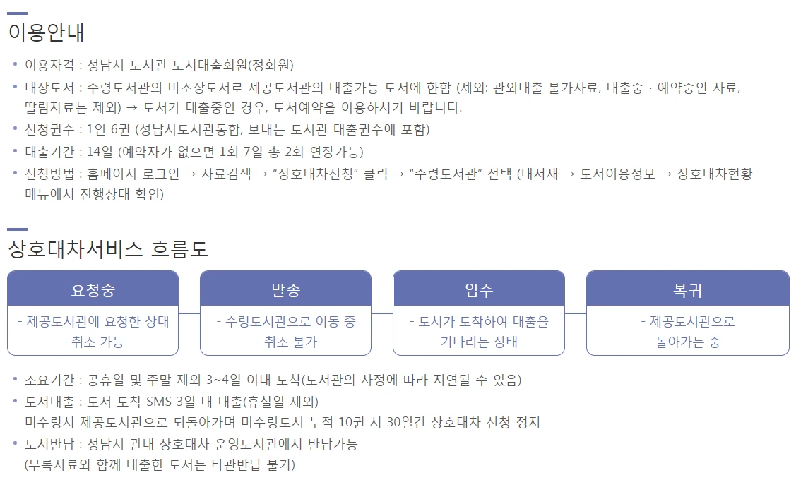 상호대차 서비스란 다른 도서관에 소장된 책을 우리 동네 도서관까지 배달해 주고 반납도 할 수 있는 서비스다. 보통 도서관 대출회원에게 제공하는 서비스로 대출기간 및 규정은 신청한 도서관에 따르되 신청 후 내가 다니는 도서관에서 책을 받아보고 반납하면 된다. 거의 대부분의 도서관에서 제공하고 있는 서비스로 각기 이용 규정은 도서관에 따라 다르니 다니는 도서관의 규정을 확인한 후 신청하면 된다.