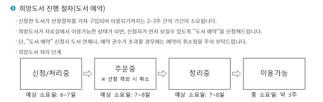 지금 신청하려는 책이 이미 소장 중은 아닌지도 확인해서 신청하는 것이 좋다. 위의 제외기준에 해당하지 않더라고 하더라도 이미 소장 중인 책이거나 다른 이용자가 먼저 신청해서 구입을 진행하고 있는 책이라면 신청은 거절될 수도 있다.