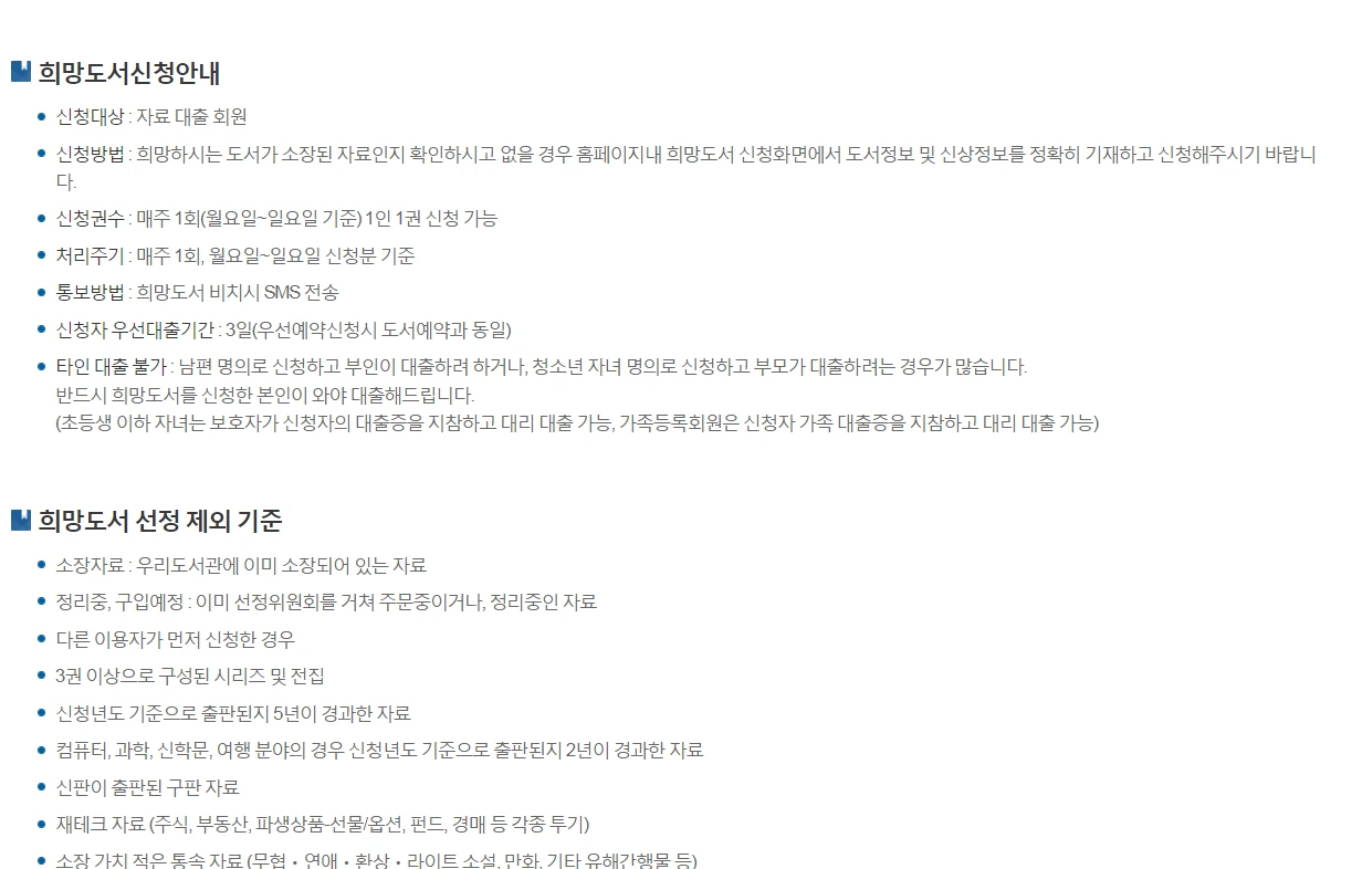 도서관마다 희망도서 신청 기준은 다르다. 신청 권수에도 차이가 있다. 예산이나 도서관 종류(공공, 대학, 연구)에 따라 구입할 수 있는 책의 종류와 정책이 다르기 때문이다. 따라서 신청 전에 내가 찾는 책이 신청 가능한 책인지 한번 확인할 필요가 있다.