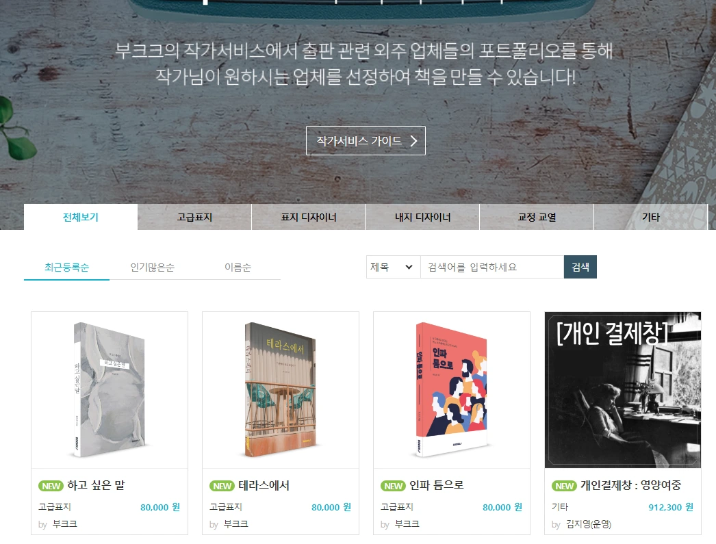 부크크 사이트 내에 디자인을 구입할 수 있는 서비스가 있다. 표지나 내지, 교정 교열 모두 가능해서 사이트에서 디자인을 구입해서 사용해도 된다. 표지 디자인의 경우 부크크에서 기본 디자인을 제공하기도 한다.