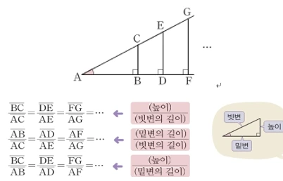 가 성립합니다. 이처럼 직각삼각형 에서 각 A의 크기가 정해지면, 직각삼각형의 크기와 관계없이 밑변, 높이, 빗변의 값 사이의 비율이 항상 일정합니다.