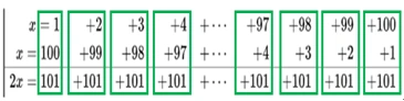 가우스가 어린 나이에 1부터 100까지 합을 다음과 같은 계산식으로 구했다고 합니다.