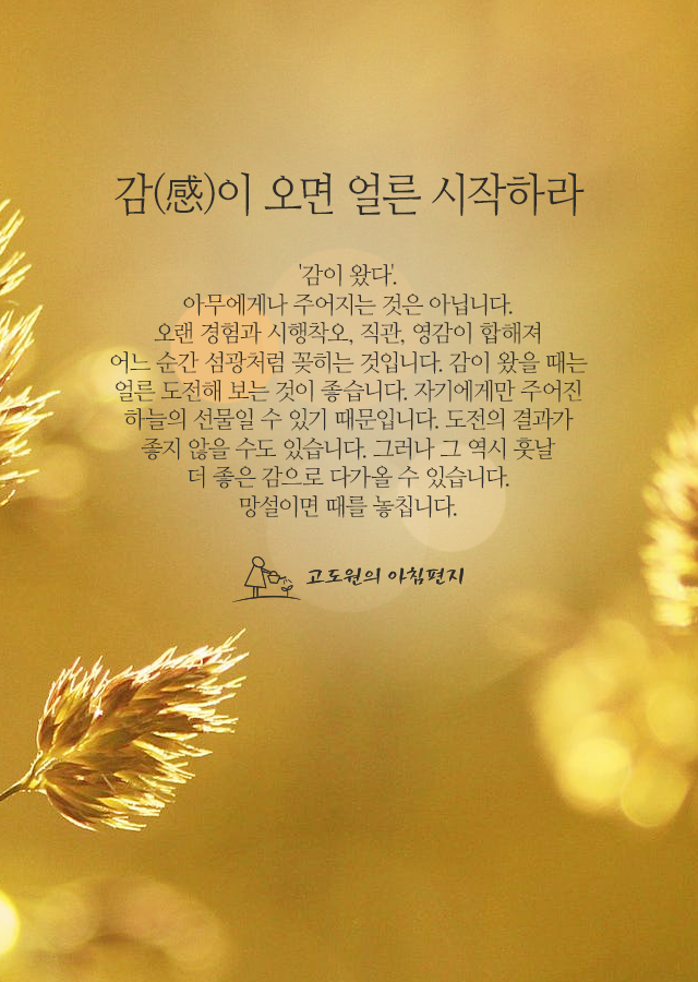 어느 순간 섬광처럼 꽂히는 것입니다. 감이 왔을 때는 얼른 도전해 보는 것이 좋습니다.