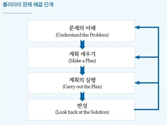 폴리아는 심리적으로 복잡하게 연결된 문제 해결 단계를 네 단계로 명쾌하게 정리했습니다. 위의 그림을 확인해주시기 바랍니다.