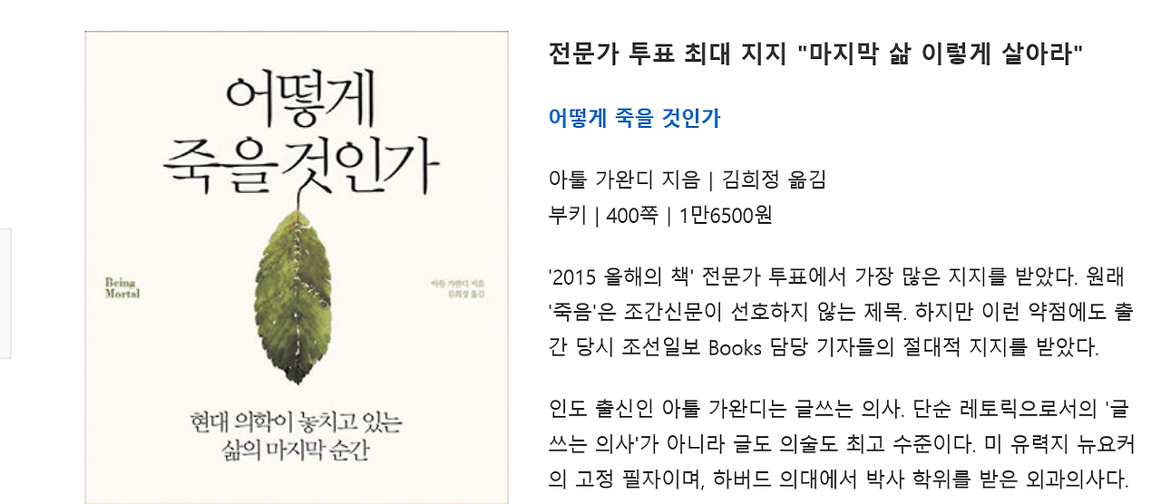 나는 이런 의견을 담은 책이 최고의 책으로 선정되고, 미국에서는 2014 년의 뉴욕 타임즈나 아마존에서 최고의 책으로 선정되는 것을 보면서 많은 사람들이 삶에 대해서 진지 하게생각을 하는 구나를 느꼈다. 어쩌면 죽음은 나이 많은 사람이나 운이 나쁜 사람들에게 오는 것쯤으로 생각하다가 이 책이 죽음을 자신의 일로 받아 들이게 했는지도 모른다.