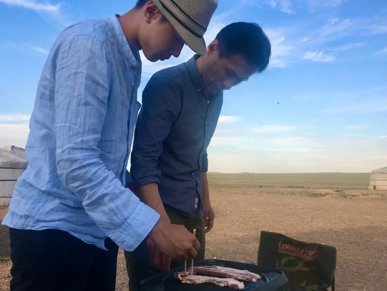 사막에 지글지글 고기 구워지는 소리와 기름진 냄새가 퍼져나간다.