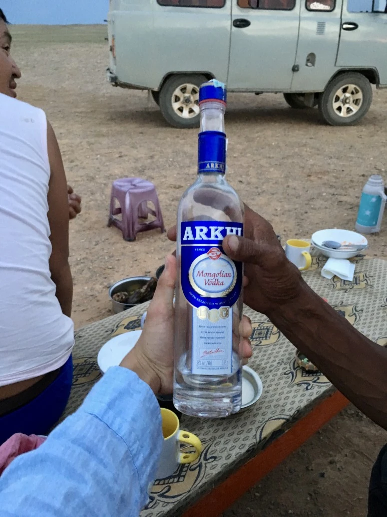 그러자 게르 안에서 반짝이는 병을 들고 나온다.
