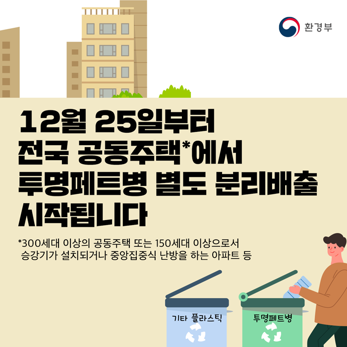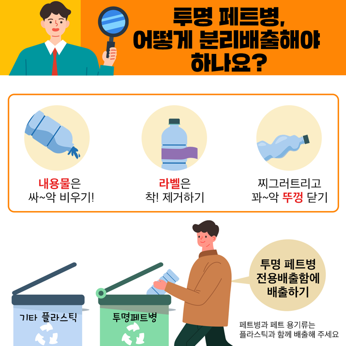 작년 12월부터 투명 페트병 분리 배출 제도가 생겼다. 이제는 투명한 페트병은 플라스틱으로 버리는 게 아니라 따로 모아 버려야 한다. 그렇다고 그냥 버려서는 안 된다.