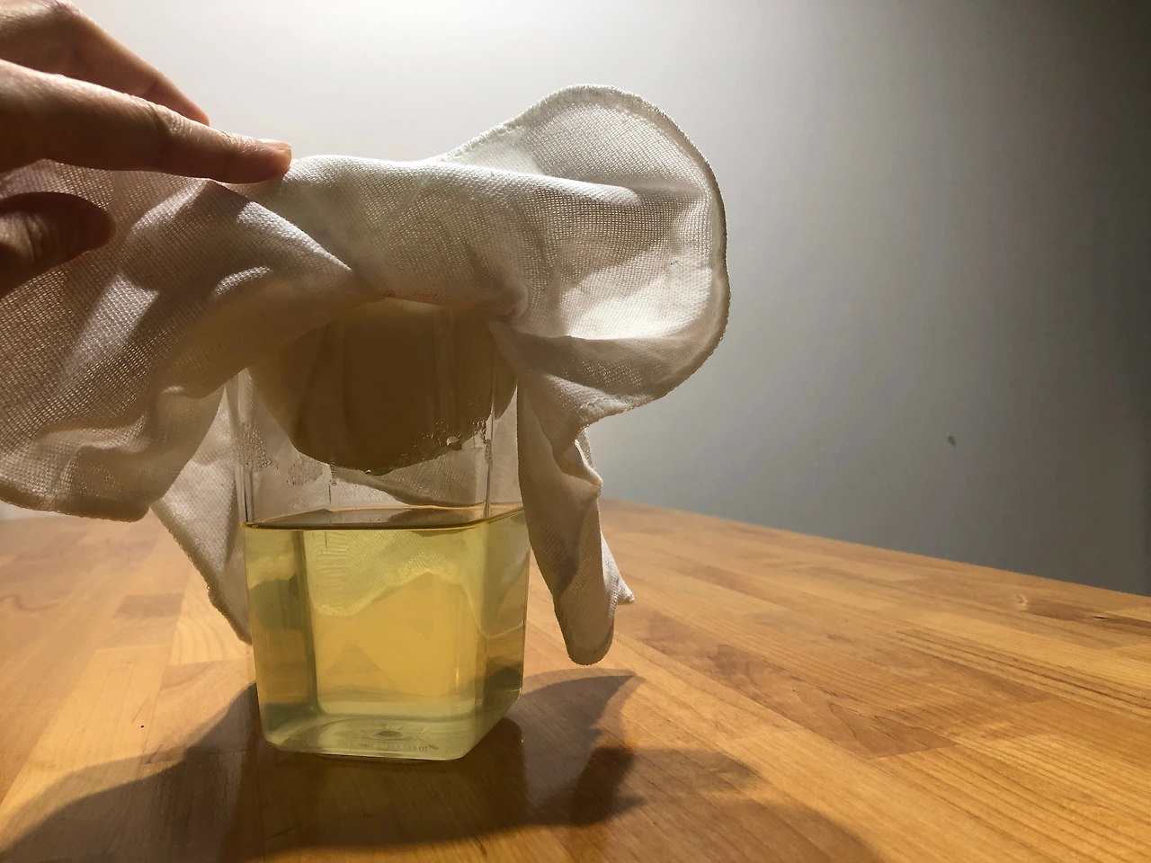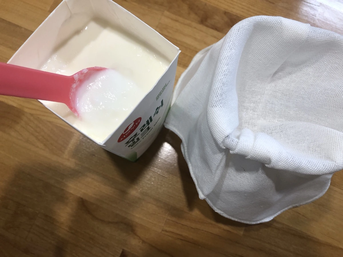 5. 1-2시간 후 꺼내면 우리가 아는 요거트가 돼있을 것이다. 그릭요거트는 여기서 유청을 빼준다. 깊은 통에 면포를 고무줄로 고정하고 요거트를 올려준다.