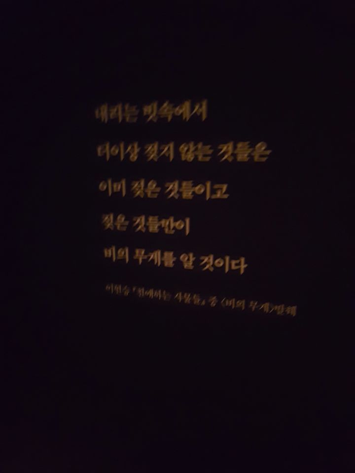 "내리는 빗 속에서 더 이상 젖지 않는 것들은 이미 젖은 것들이고 젖은 것들만이 비의 무게를 알 것이다."